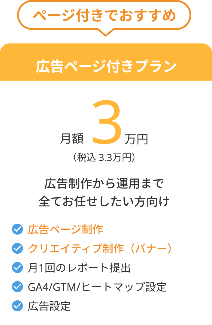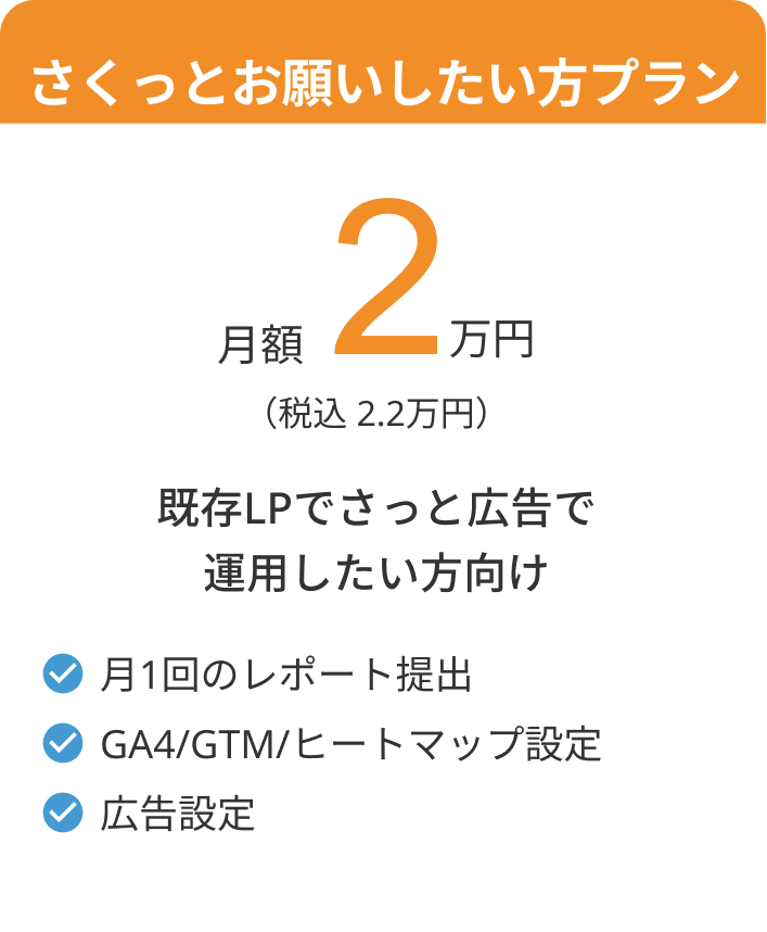 一般的には広告費に対して20%が運用費。最低広告費が30万などの企業様が多いです。しかしそれだと、これからテスト的に初めて見たい方にはハードルが高い為、できる限り広告運用費を抑えて色々な方に体験をして頂きたいと考え、格安プランを作成しております。その為、コンサルタントのような毎月の細かなレポーティングや毎週MTGなどを極力減らし、ご提供できるサービスといたしました。