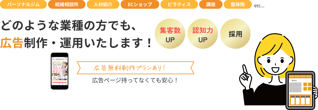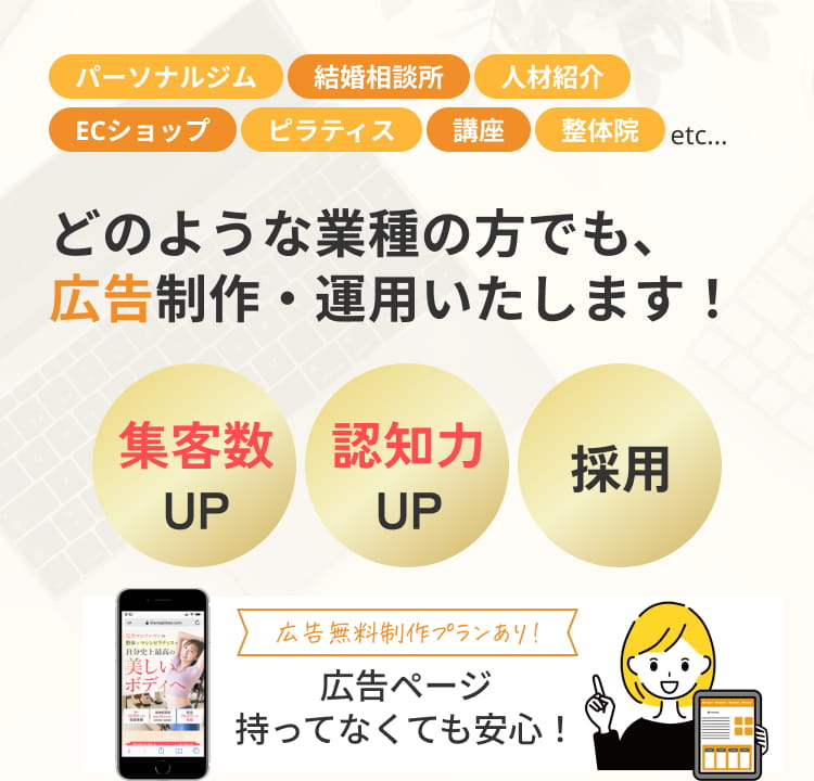 現在たくさんのお問い合わせをいただいております。無料制作・広告運用の対応できる数に限りがありますので、お早めにお申し込みください。「無料広告制作」は毎月5社限定です。