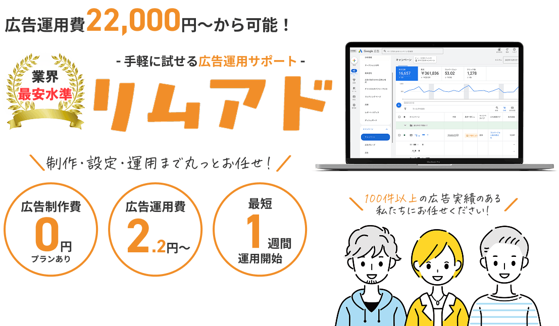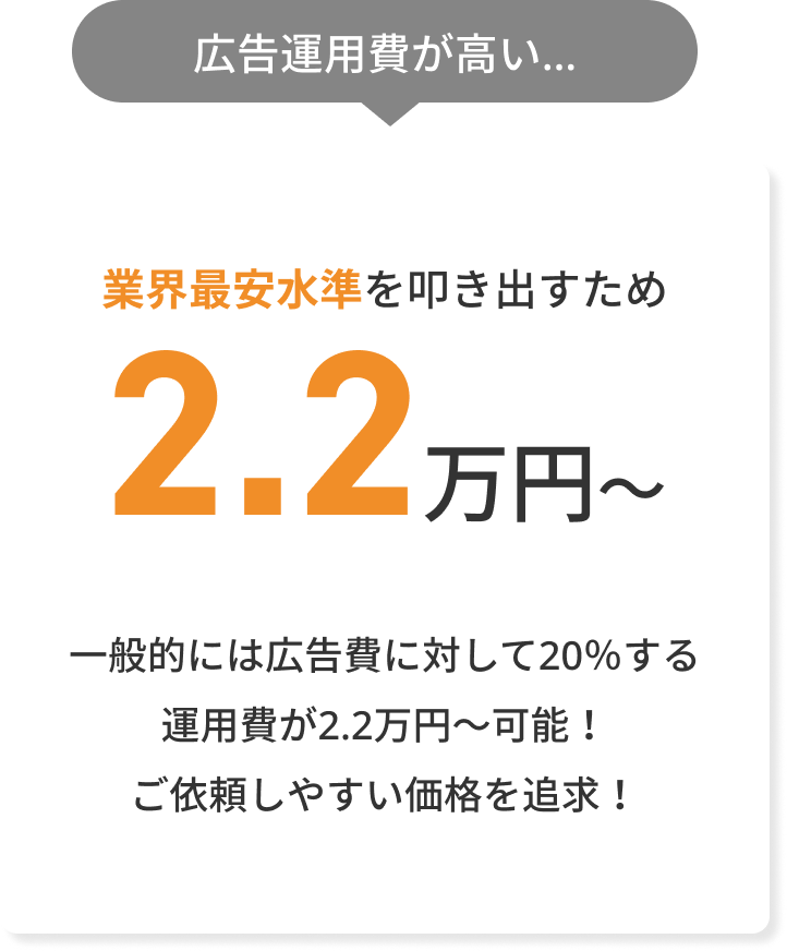 一般的には、20%の広告運用費・毎月30万以上の広告費を出せるクライアント様しか受け付けない代理店が多いです。それは、20%が相場であり、また広告費用が低い場合結果も出しづらく、また運用フィーも少なくなる為お断りするケースとなります。弊社の場合は、お手軽に試せる2.2万〜のプランもご用意しており、「せっかくだしやってみよう」と言ってくれる方が非常に多いのが特徴です。