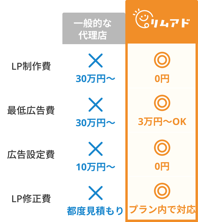 一般的には、初期設定費用は10-20万となります。広告ページへのタグ埋め込み、計測器の設定、広告媒体の設定など各対応が多い為です。しかし弊社の場合は、1人でも多くの方に広告集客を試したいただきたい!と考え、初期費用を0円でご提供させていただいております。