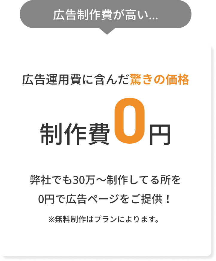 弊社では、広告制作は1本25万円から請け負っている所を、広告運用をご依頼の方に限定で0円で提供。その秘密は、完全オリジナルの広告制作ではなく、過去の実績を元に作られた「成果の出やすい型」をベースに作成しているからです。その為、効率よく制作が可能となっている為、運用ご依頼の方には0円でご提供させていただいております。